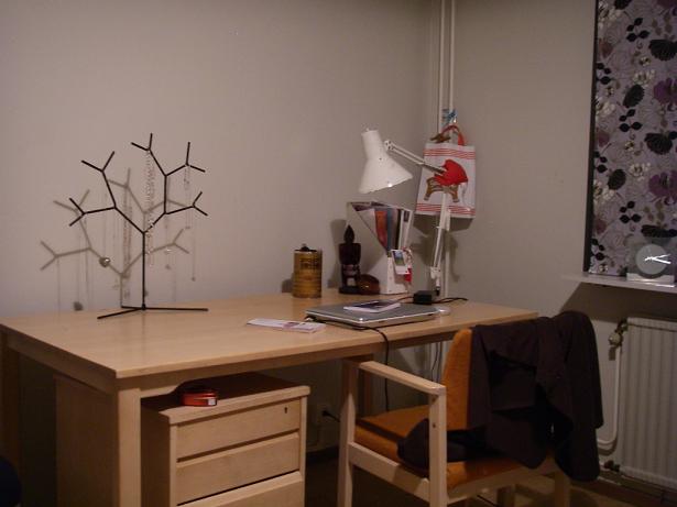 布を買ってきてカーテンにしました。机の上の木はもちろんイケアです。